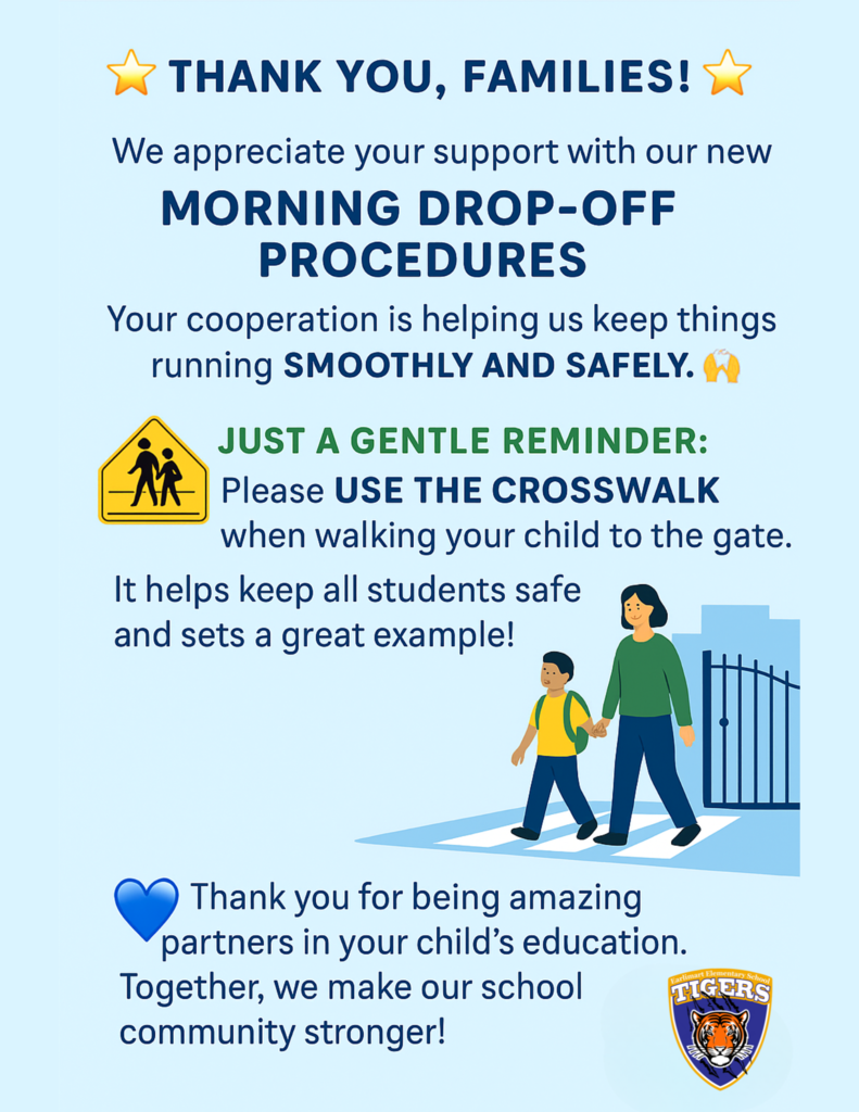 SOLO UN AMABLE RECORDATORIO: Por favor, utilice el paso de peatones al caminar a su estudiante a la puerta. Ayuda a mantener a todos los estudiantes seguros ¡y da un gran ejemplo!